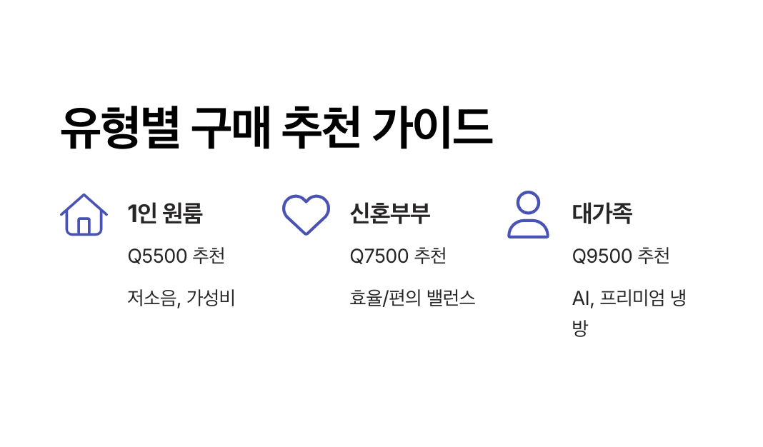 | Q7500 Standard | 1,450,000 | 듀얼 냉방 코어·스마트 인버터·안심 필터 플러스 | 중형 가구·신혼 부부 |
