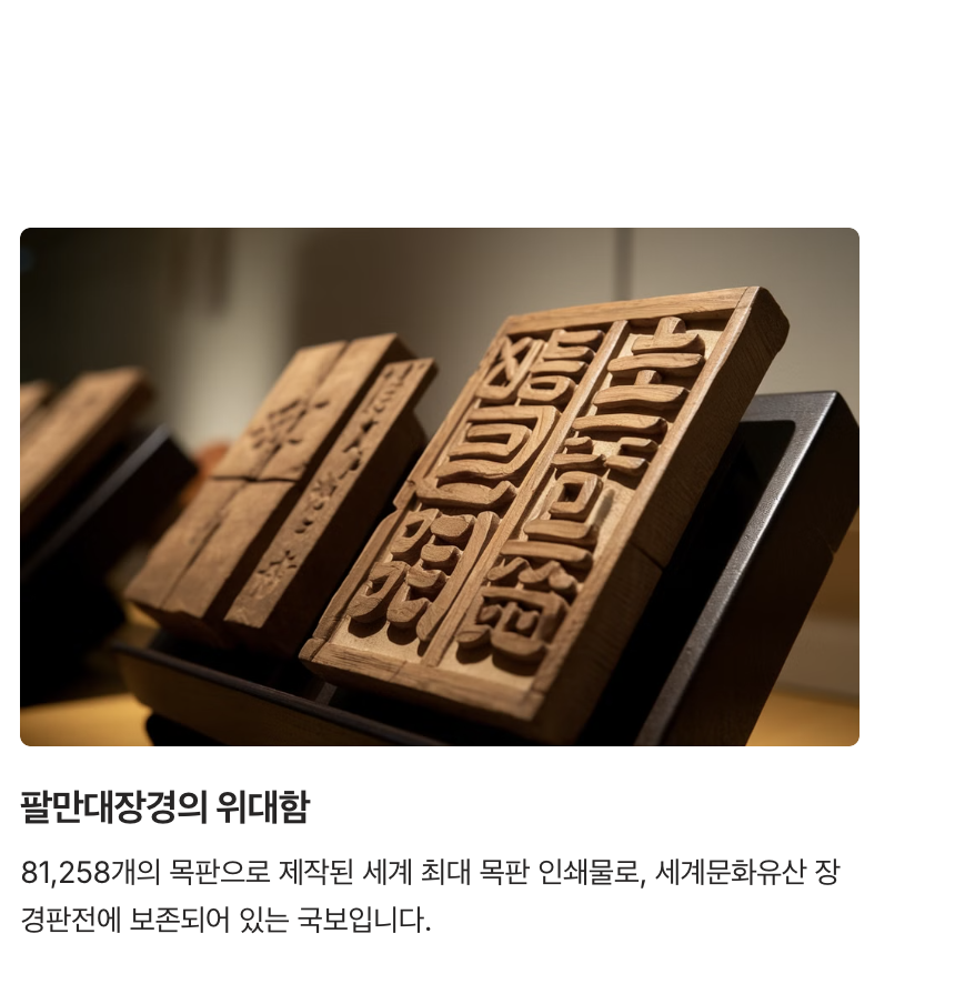 팔만대장경의 보존 과정은 세계적으로도 독특합니다. 장경판전(경판을 보관하는 전각)은 자연 환기 시스템을 갖추고 있어 온도와 습도를 일정하게 유지하며, 목판을 오랜 세월 동안 완벽히 보존하고 있습니다. 장경판전은 목재 건축물의 우수성을 보여주는 대표적인 사례로, 유네스코 세계문화유산에 등재되어 있습니다.