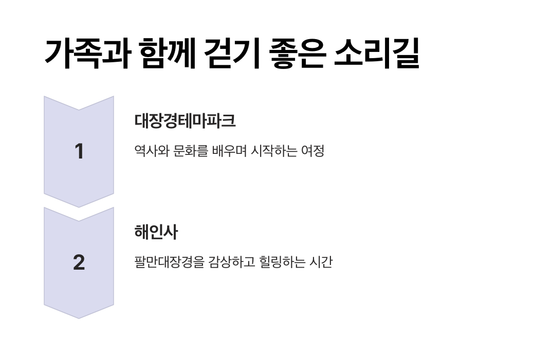 가야산 소리길은 대장경테마파크에서 해인사까지 약 7.3km로 이어지는 탐방로입니다. 이 코스는 계곡을 따라 걷는 평탄한 길로, 자연의 소리를 들으며 편안히 걸을 수 있는 힐링 코스로 유명합니다.