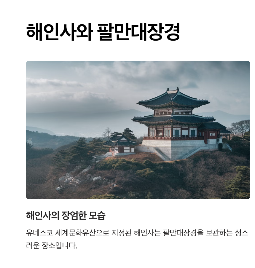 - 소개: 해인사의 역사와 팔만대장경, 장경판전 등 문화재 정보를 확인할 수 있습니다. 관람료와 운영 시간, 템플스테이 신청도 가능합니다.