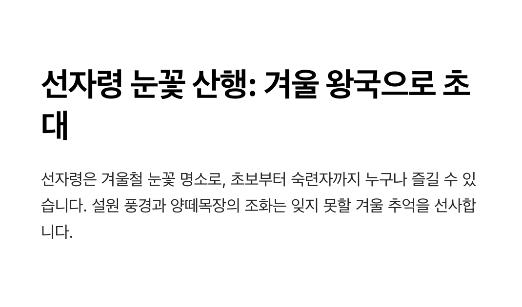 선자령은 겨울철 트레킹의 매력을 온전히 느낄 수 있는 명소입니다. 초보자도 쉽게 도전할 수 있는 코스부터 숙련자를 위한 장시간 코스까지, 누구나 자신의 수준에 맞게 즐길 수 있습니다.