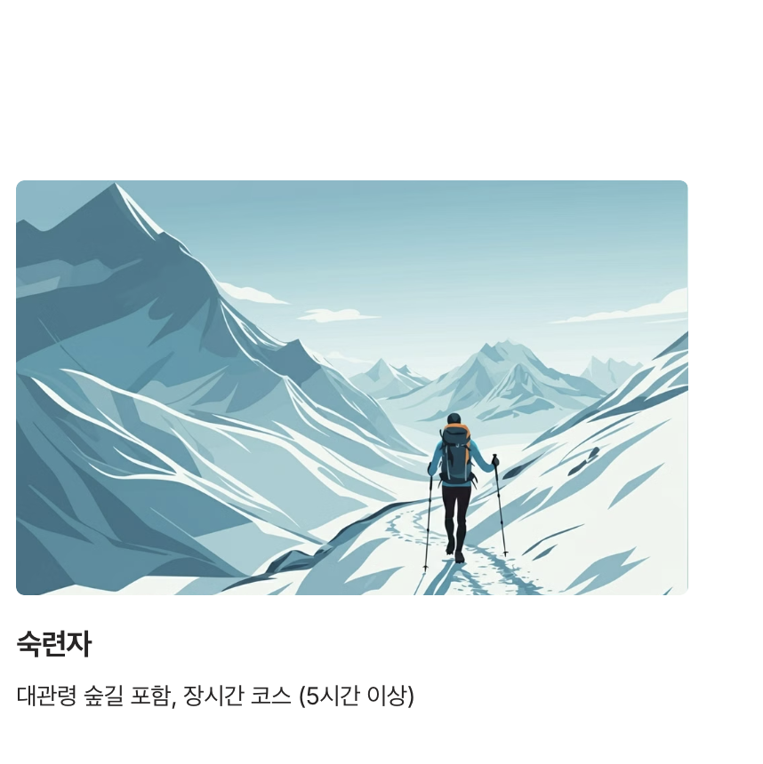 - A2. 초보자 코스(2시간 왕복)는 경사가 완만하고 길이 잘 정비되어 있어 아이와 함께 가기에도 안전합니다. 단, 방한 장비와 간식을 충분히 준비하세요.