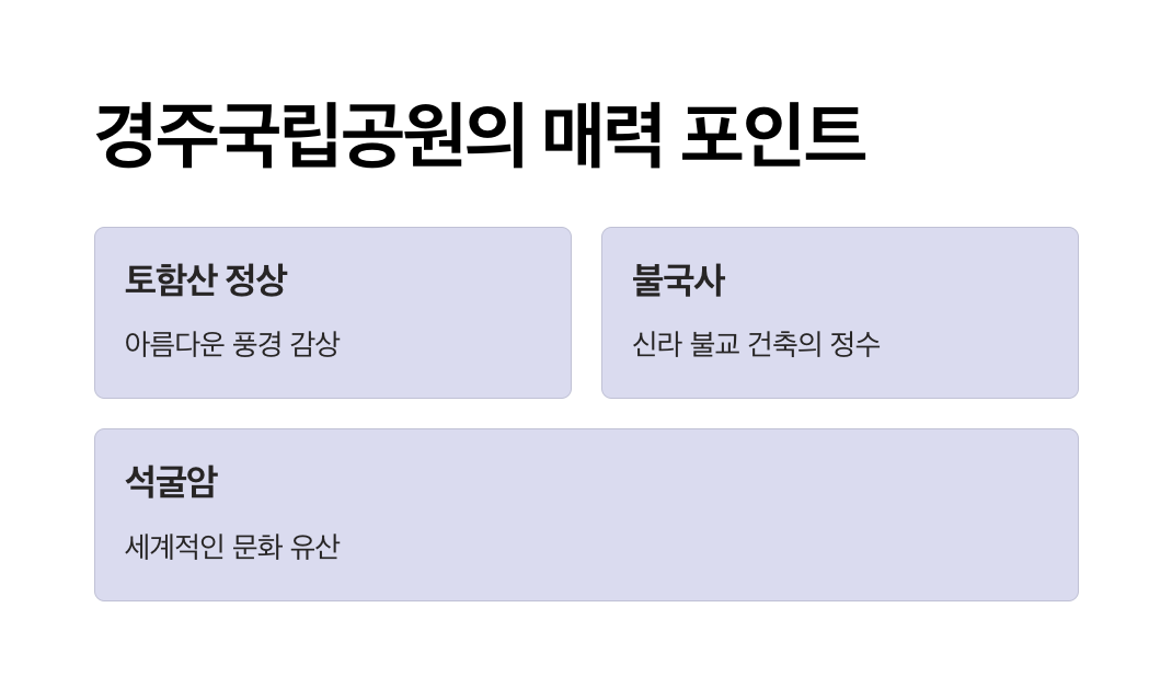 - A1. 경주국립공원은 사계절 내내 다양한 매력을 제공합니다. 봄에는 벚꽃과 야생화를, 가을에는 단풍을 즐기기에 좋습니다. 겨울에는 맑은 날씨에 설경과 일출을 감상할 수 있습니다.