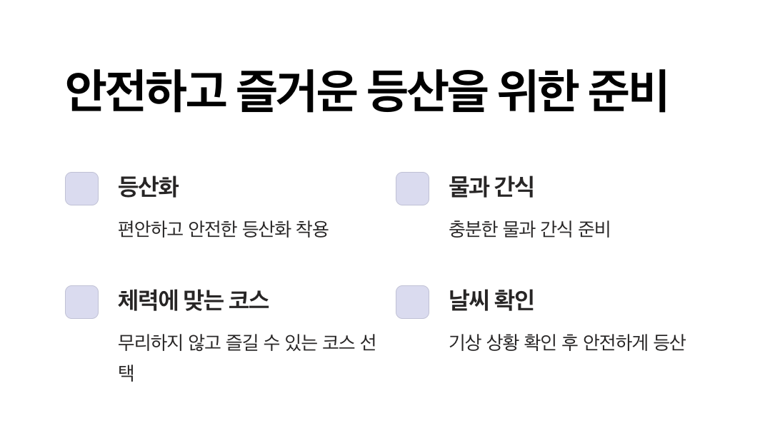 - 필수 장비: 등산화, 모자, 물, 간단한 간식, 방한용품(겨울), 자외선 차단제(여름).