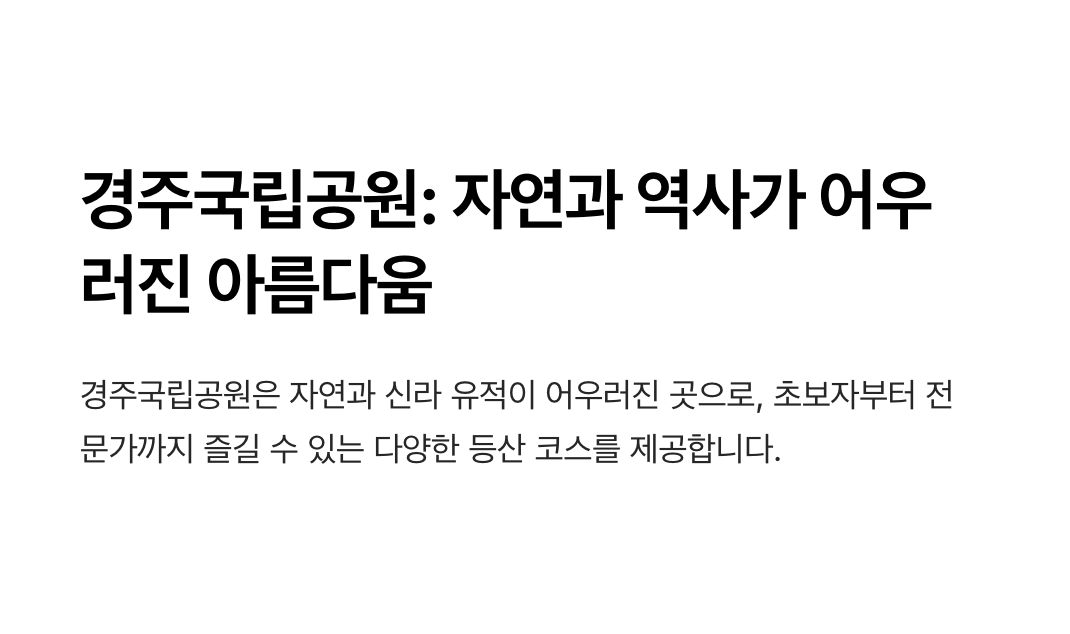 | 2. 경주시 관광 정보 포털 | 경주국립공원 및 주변 관광 명소, 맛집, 숙박 정보 등을 제공하는 경주시 공식 관광 포털입니다. |