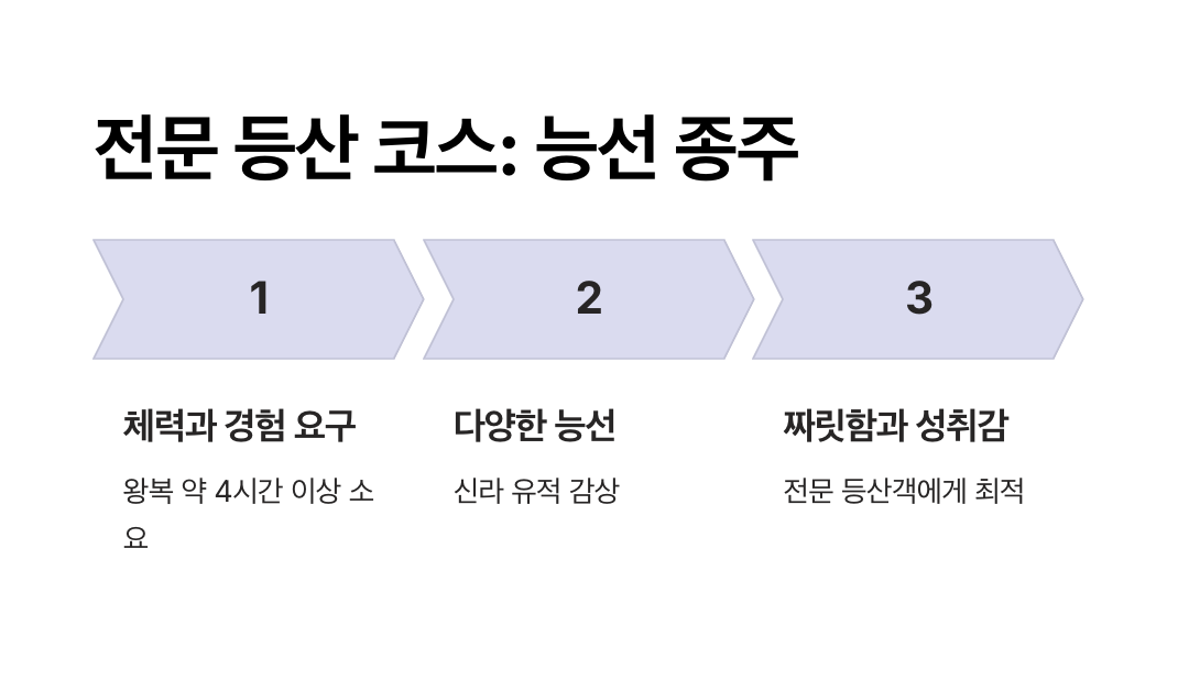 능선 종주 코스는 체력과 경험이 요구되는 전문가용 코스로, 다양한 지형을 경험하며 자연과 경주의 전경을 감상할 수 있습니다. 오르막과 내리막이 반복되며, 긴 거리를 걸어야 하므로 체력 분배가 중요합니다.