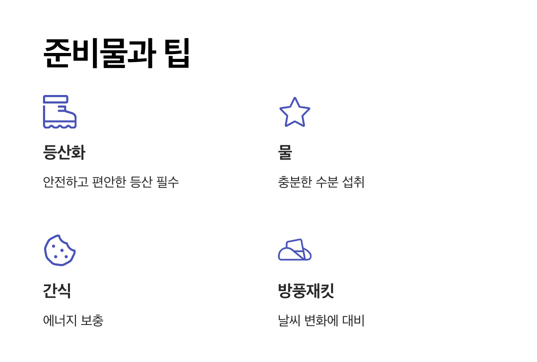 - 신발: 돌계단 구간이 있으므로 미끄럼 방지 기능이 있는 등산화 착용 추천.