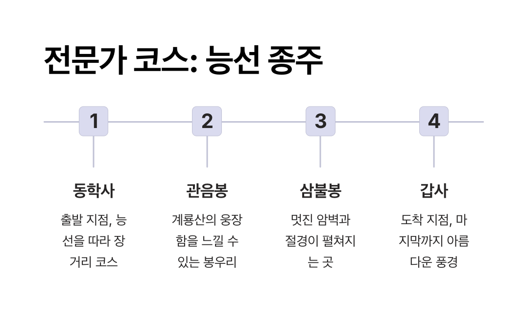 - A5. 능선 종주 코스는 숙련된 등산객을 위한 고난도 코스입니다. 초보자라면 안전상의 이유로 추천하지 않으며, 먼저 동학사 둘레길이나 갑사~관음봉 코스를 경험한 후에 도전하는 것이 좋습니다.