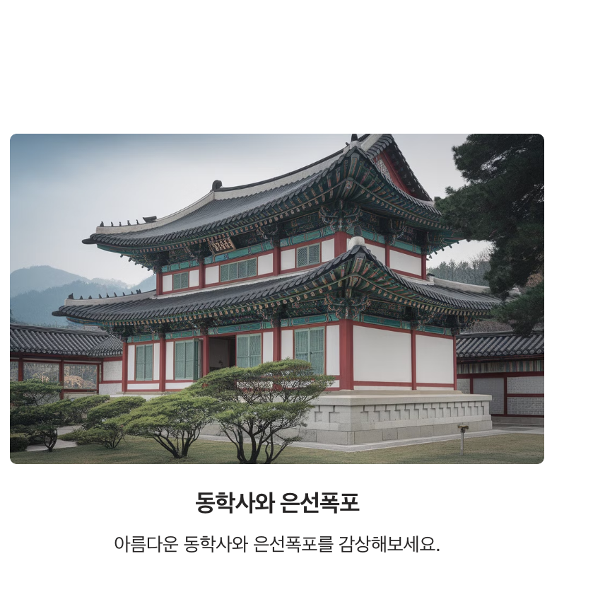 - 가을: 단풍이 절정에 달해 자연 경관을 만끽할 수 있는 최적의 시기.