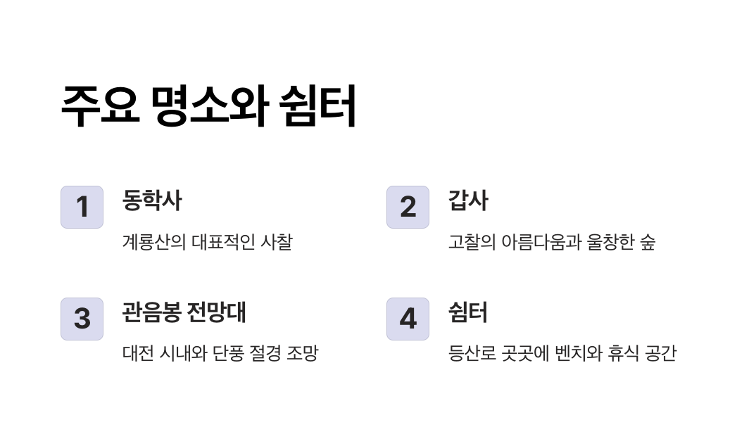 | 3. 대전광역시 관광 안내 | 계룡산을 포함한 대전 지역 관광 명소와 맛집 정보를 제공합니다. 계룡산 등산 후 주변 관광 일정을 계획할 때 유용합니다. |