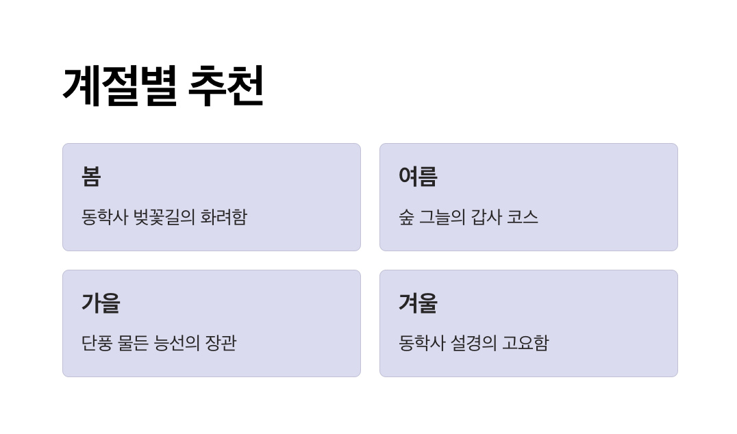 - 봄: 벚꽃과 야생화가 만개한 동학사 둘레길과 신록이 어우러진 능선 코스 추천.