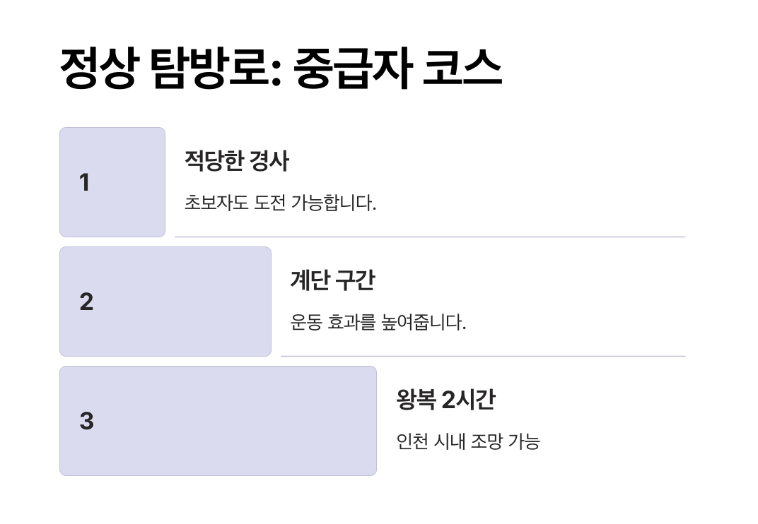 - 적당한 경사와 계단 구간이 있어 초보자도 도전할 수 있는 코스.
