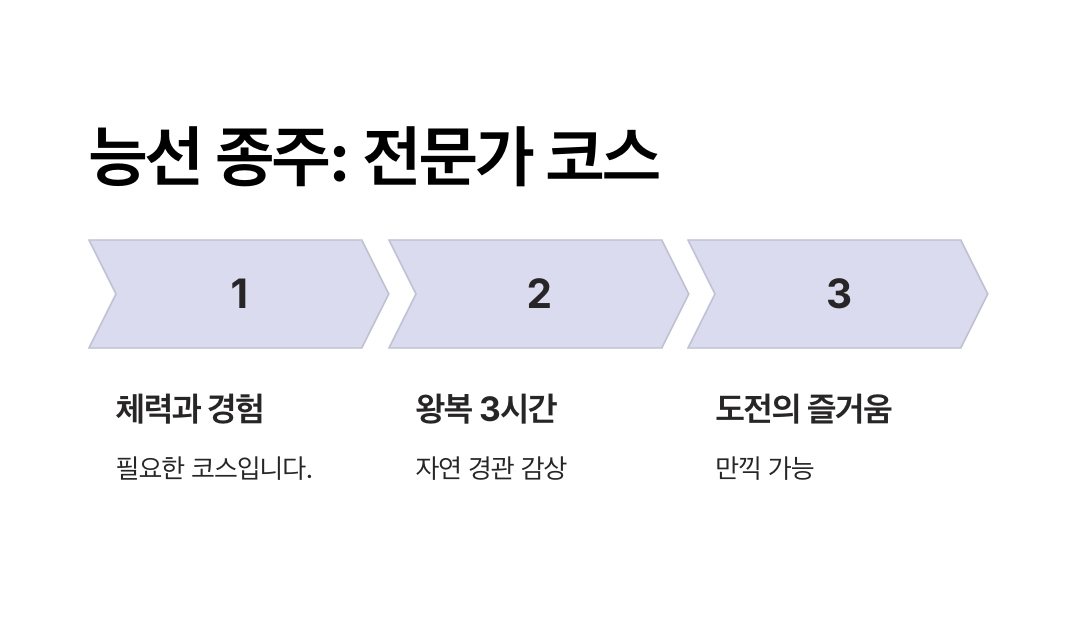 - 등산화, 모자, 물, 간단한 간식은 꼭 준비하세요. 여름철에는 벌레 퇴치제도 유용합니다.