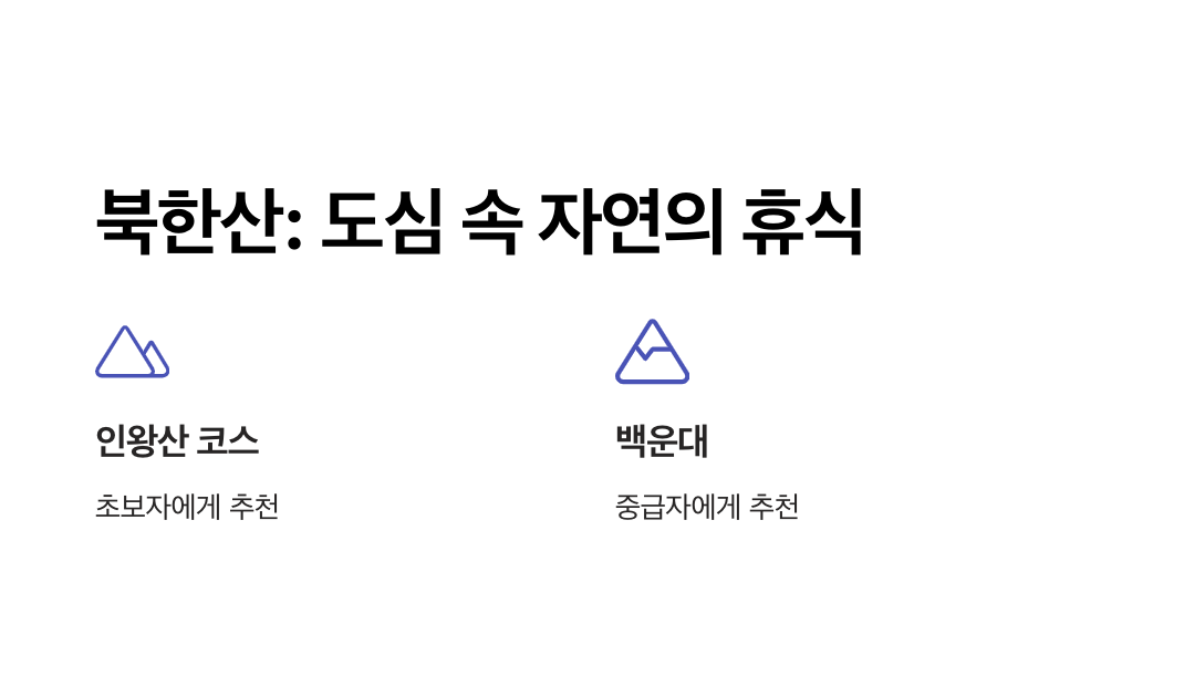 - 중급자: 백운대 코스는 가파르지만 정상에서 서울 전경을 내려다볼 수 있는 최고의 장소입니다.