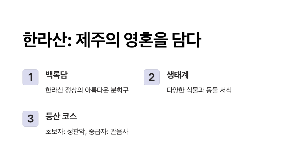 - 주요 명소: 백록담, 관음사, 성판악 코스.