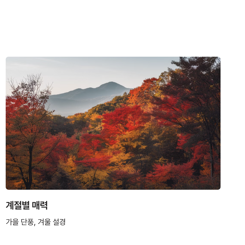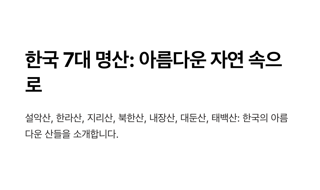 | 4. 한국관광공사 공식 사이트 | 설악산, 지리산, 대둔산 등 한국 명산의 관광 정보와 여행 팁을 제공합니다. 계절별 추천 코스와 주변 관광지도 확인할 수 있습니다. |