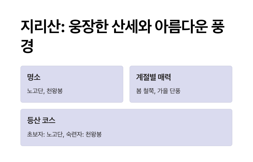 - 주요 명소: 노고단, 천왕봉, 반야봉, 화엄사.