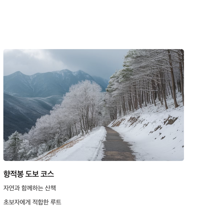 - 추천 이유: 겨울 산행을 즐기는 중급자에게 적합하며, 자연 그대로의 설경을 감상하기 좋은 코스입니다.