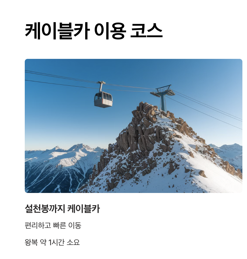 - 추천 이유: 가족 단위, 어린이를 동반한 여행자, 또는 가벼운 산행을 원하는 분들에게 적합합니다. 케이블카 대기 시간이 길 수 있으니 이른 시간대 이용을 추천합니다.