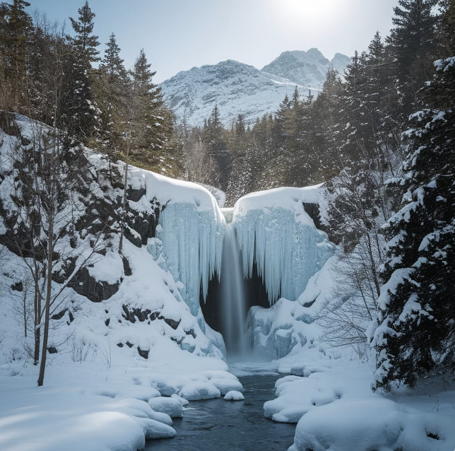 - 얼어붙은 계곡과 나무들이 겨울의 정취를 물씬 느끼게 합니다.