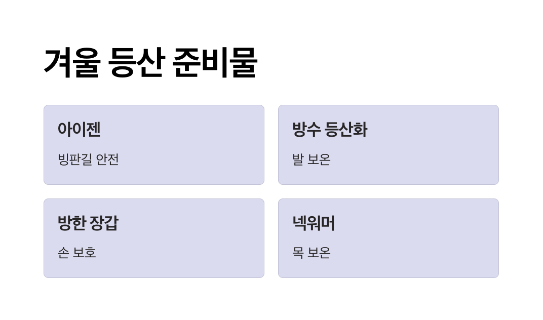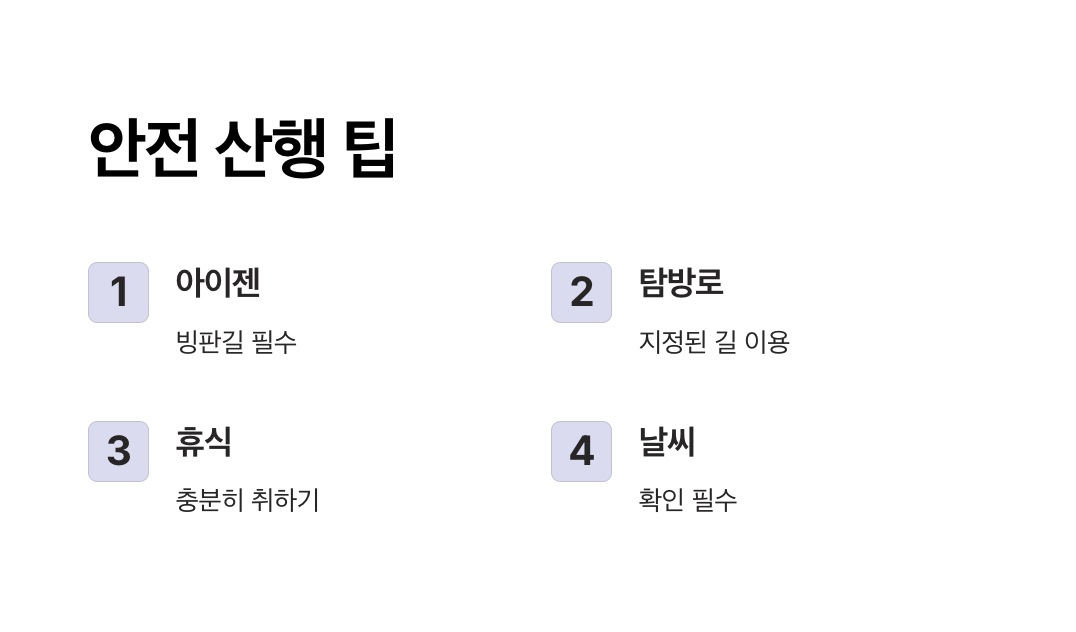 - 조명: 해가 빨리 지는 겨울에는 헤드램프나 랜턴을 준비하세요.