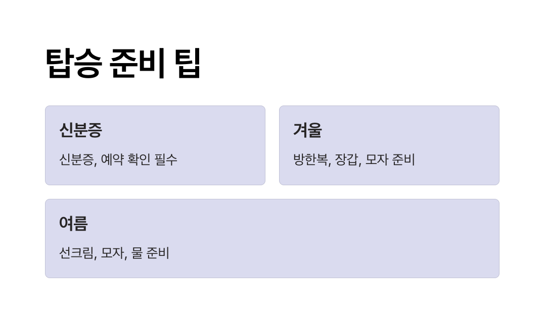 - 여름: 얇은 외투, 모자, 선크림 준비