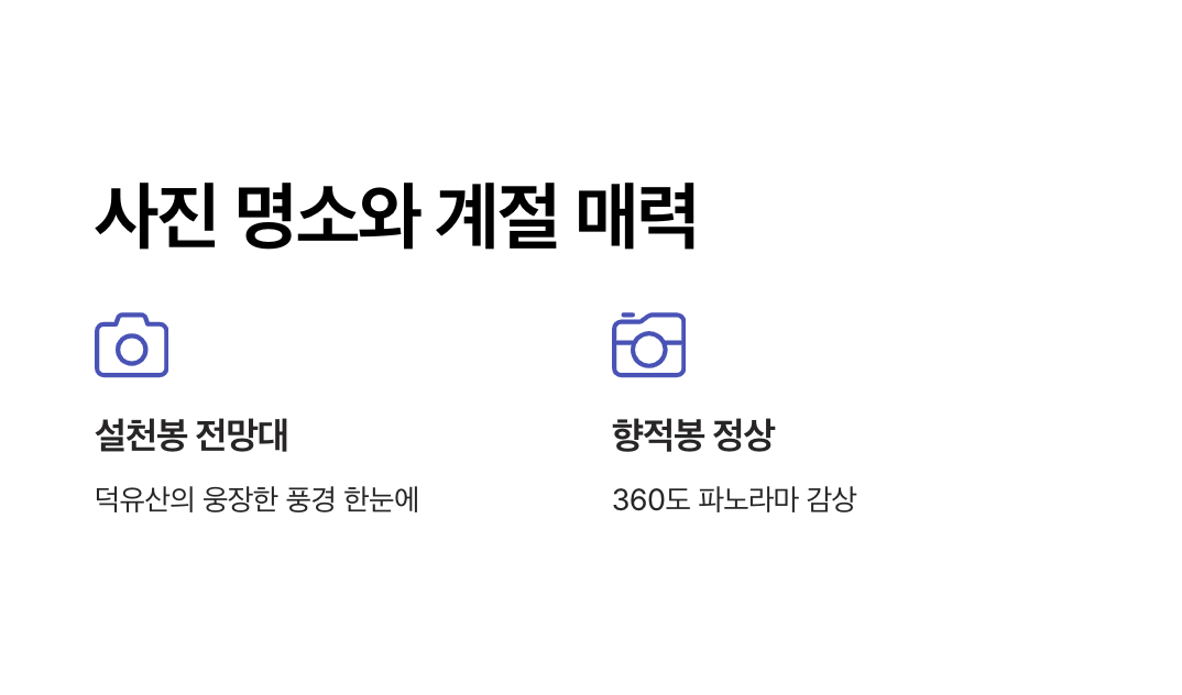 - 설천봉 전망대는 사진을 찍기 좋은 명소로, 덕유산의 전경을 한눈에 담을 수 있습니다.