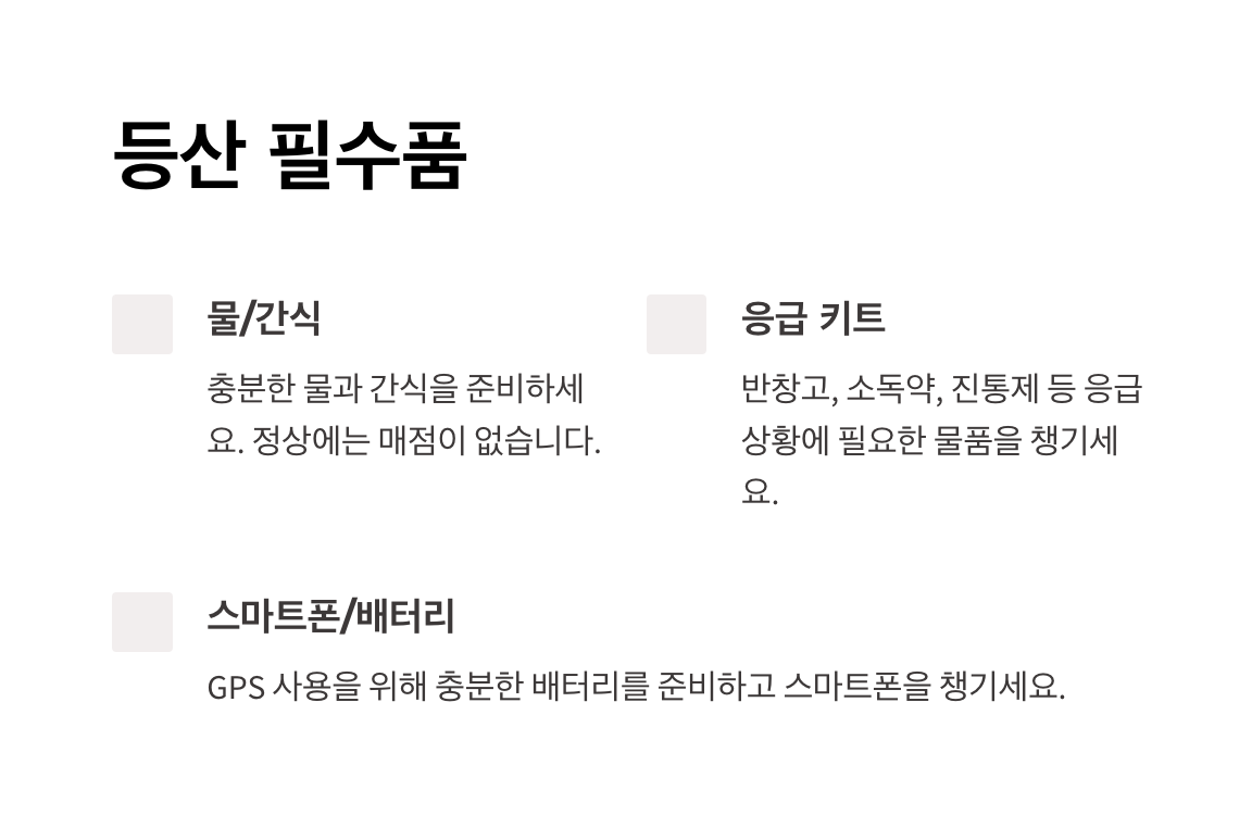 - 등산복: 가벼운 옷차림을 추천하며, 방풍 재킷을 추가로 챙기세요. 정상 부근은 기온이 낮아 체온 유지를 위해 필수입니다.