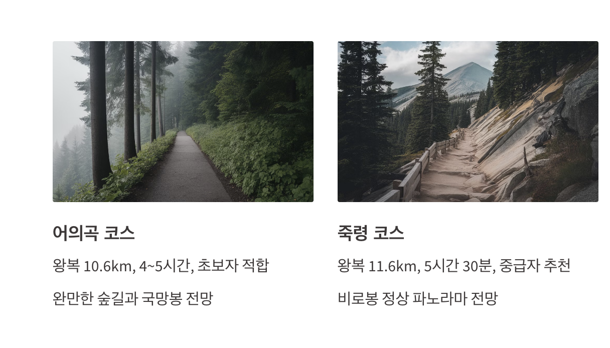 - 겨울: 눈 덮인 설경이 장관을 이루며, 눈꽃 트레킹으로 인기가 많습니다.