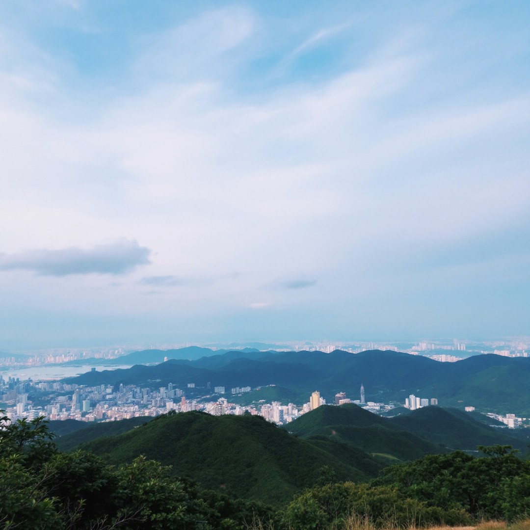 - 정상 직전 숲길 틈 사이 조망: 해질 무렵, 도심+노을 조망 가능