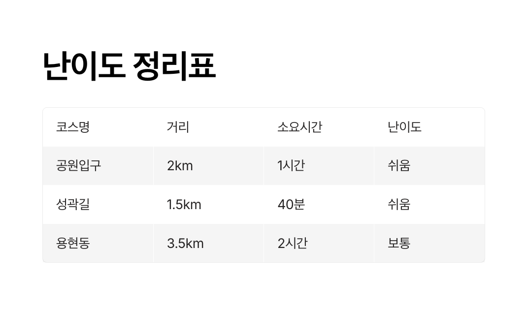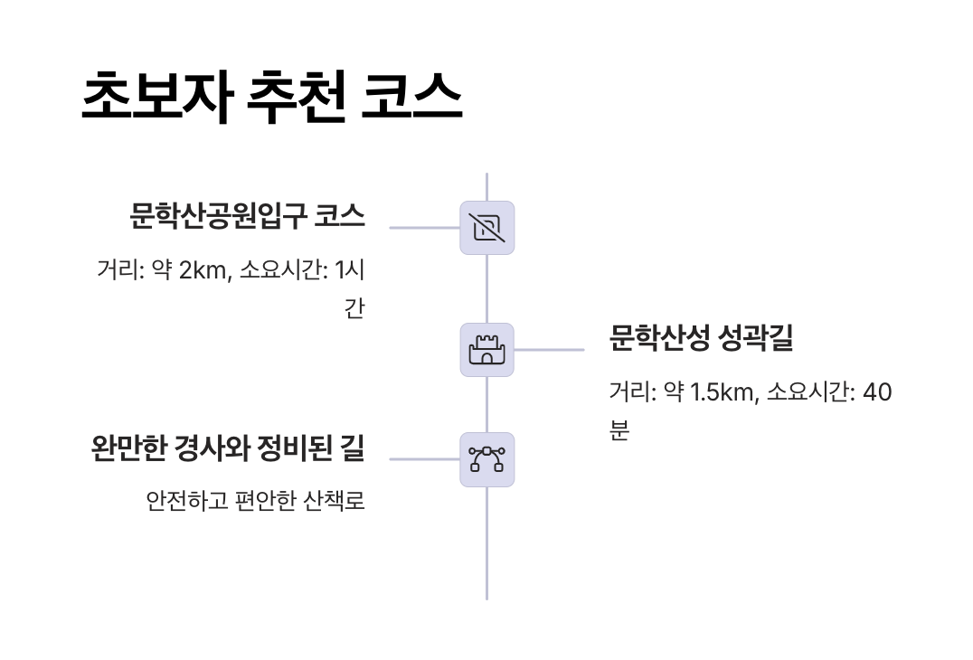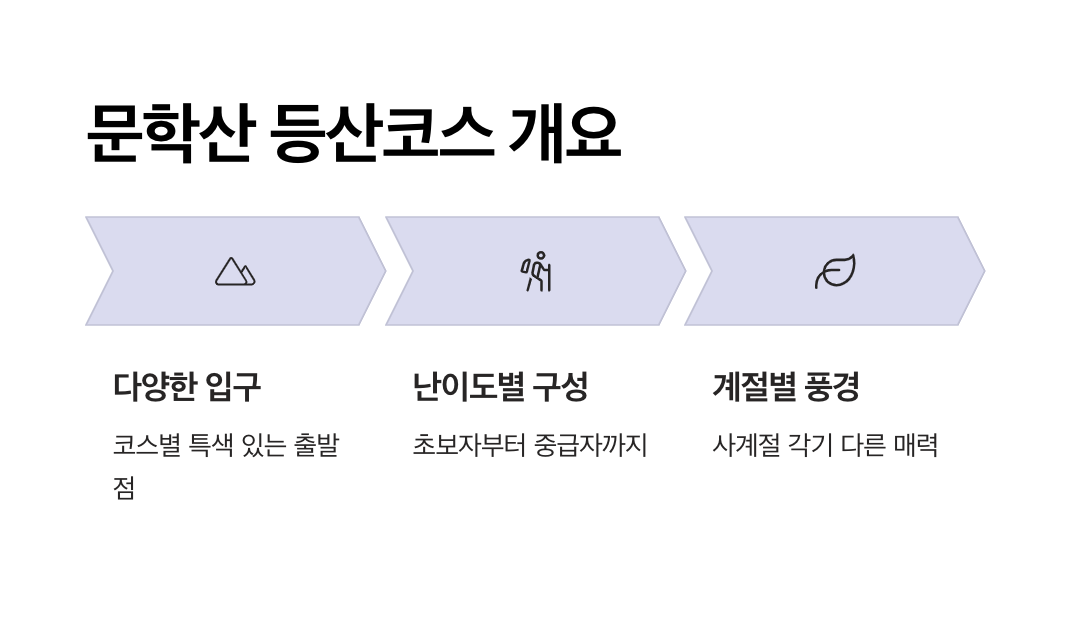 이 장에서는 문학산의 주요 코스들을 난이도, 거리, 소요 시간 기준으로 한눈에 비교할 수 있도록 정리했습니다.