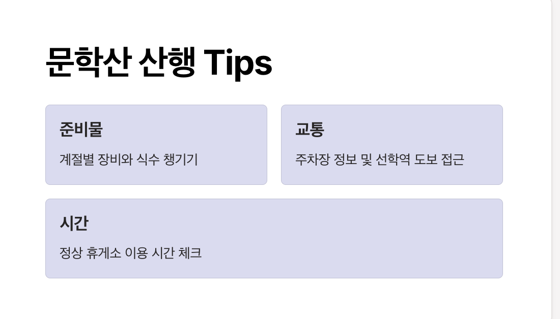 출발 전에는 주차장 위치, 대중교통 정보, 날씨와 복장까지 꼼꼼히 체크하고, 안전하고 즐거운 산행을 즐겨보시기 바랍니다.