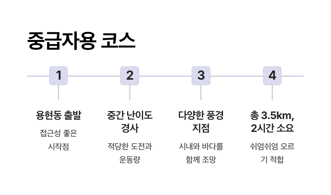 | 용현동 숲길 코스 | 용현동 성화아파트 뒤 | 약 1.7km | 약 1시간 20분 | ★★★☆☆ | 경사구간 존재, 조용하고 자연적 |