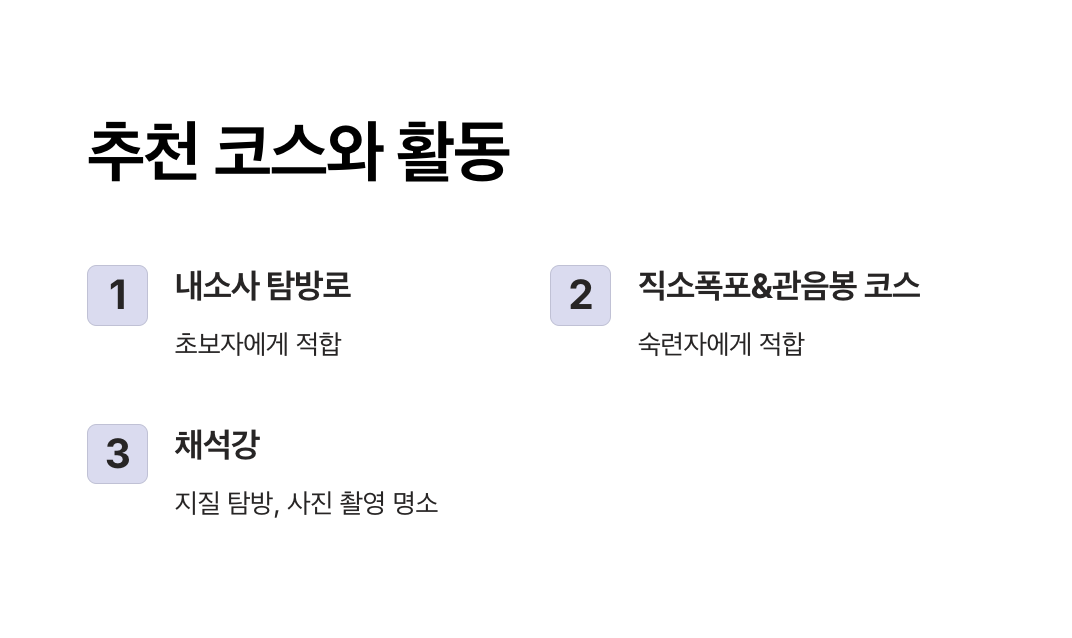 추천 이유: 가벼운 산책과 사찰 탐방이 가능하며, 힐링을 원하는 이들에게 적합합니다.