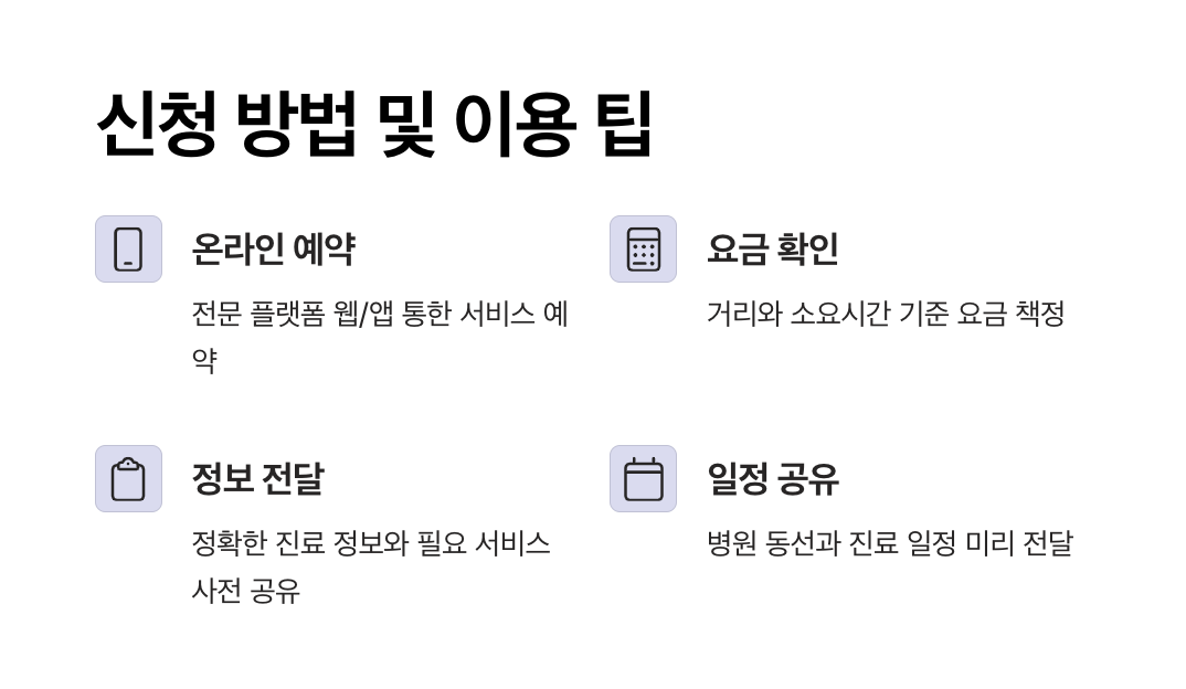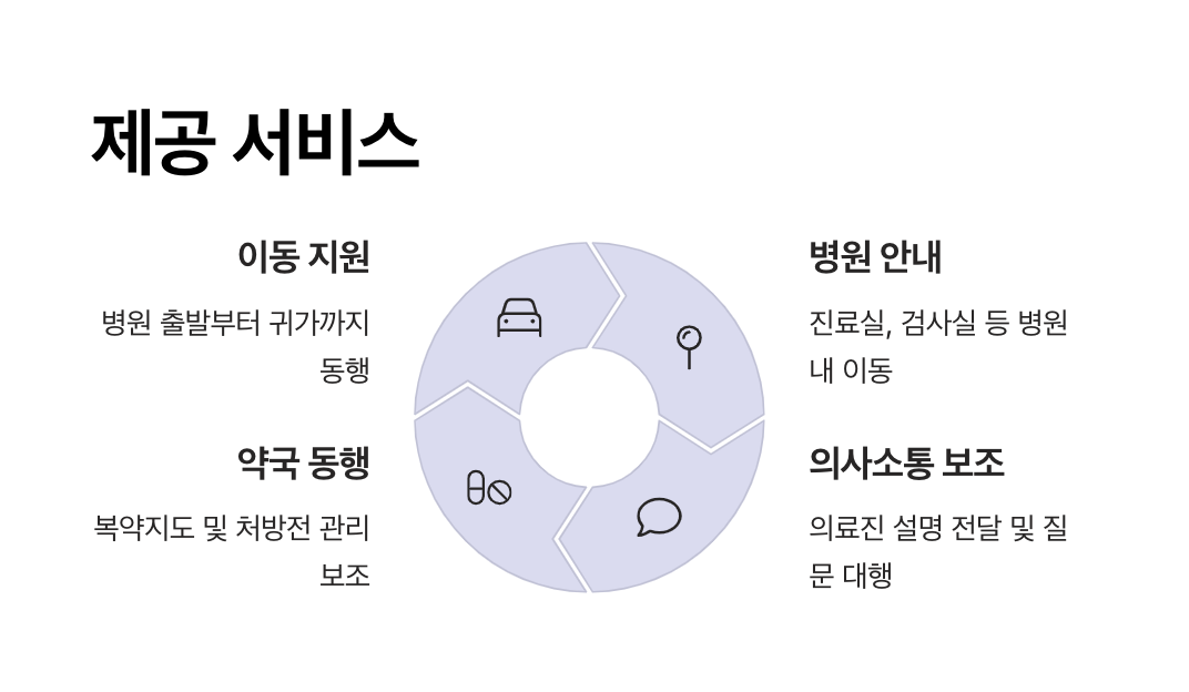 - 원스톱 지원: 예약 대행, 차량 이동, 진료 후 약국 동행까지 한 번에 처리해 이용자가 따로 일정을 신경 쓰지 않아도 됩니다.