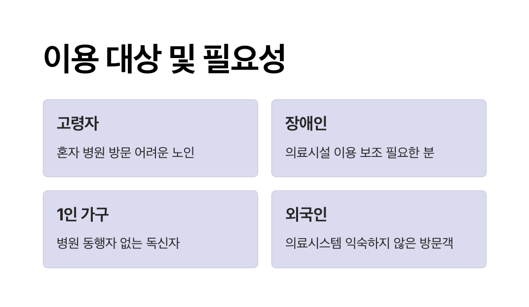 고령화 사회와 함께 1인 가구가 증가하면서, 병원 방문 시 보호자 부재로 인한 불편과 안전 문제가 더욱 부각되고 있습니다. 특히 고령자나 장애인은 대중교통 이용에 어려움을 겪거나, 진료 예약부터 이동, 복약 지도까지 전 과정에서 도움을 필요로 합니다.