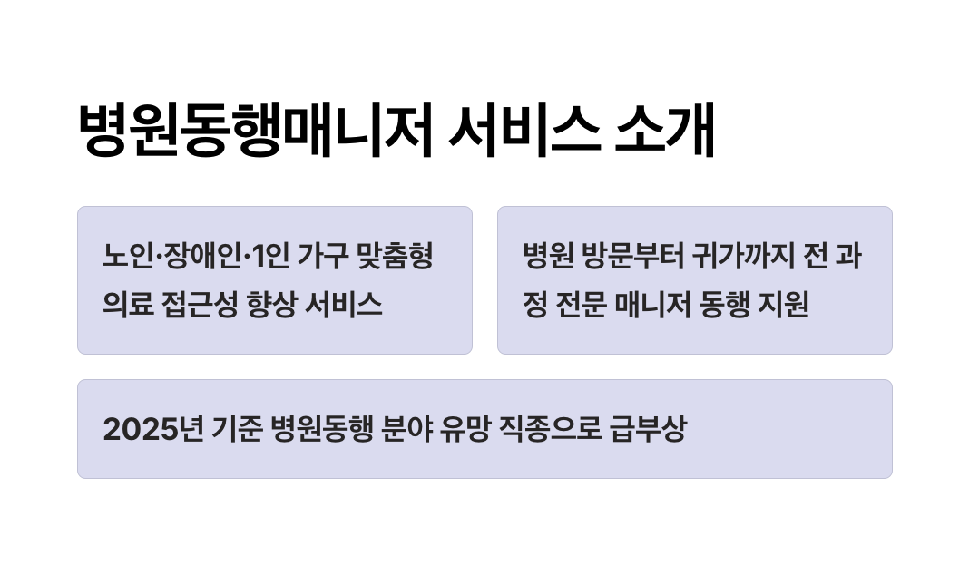 | 서울시 병원 안심동행서비스 | 서울시에 거주하는 1인 가구 및 거동 불편 시민을 대상으로 병원 출발부터 귀가까지 대중교통으로 동행하며 접수·수납·약국 동행 등을 지원하는 공공 서비스입니다. |