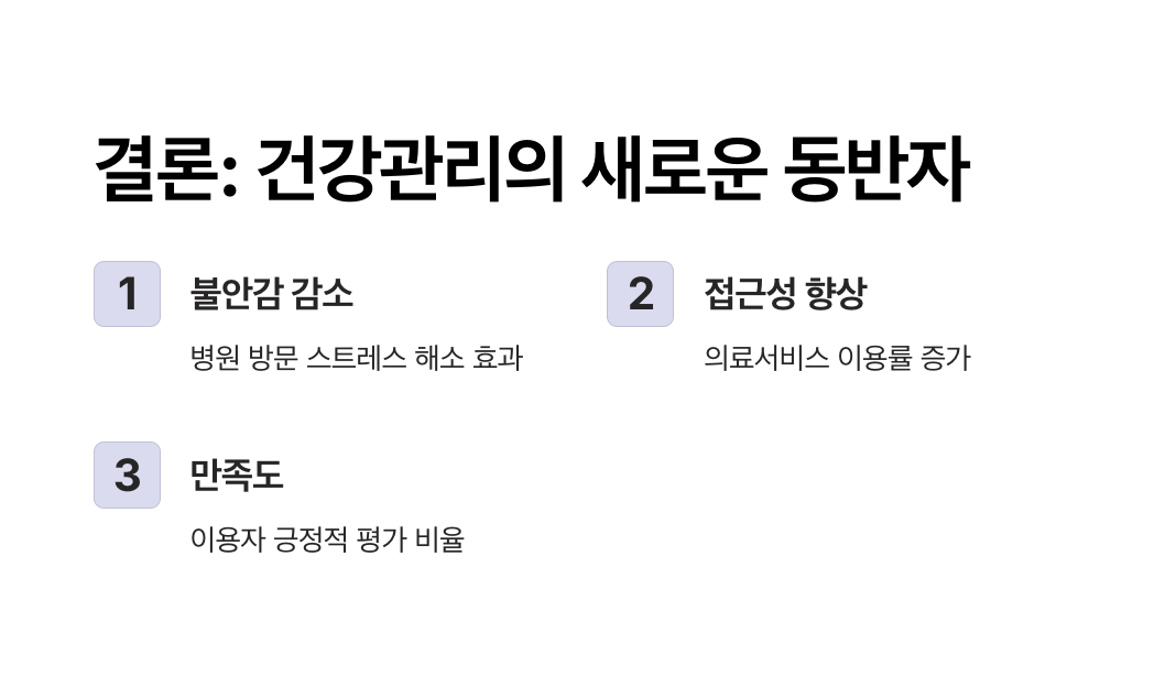 - 안정감 향상: 이용자 95% 이상이 “병원 방문에 대한 불안이 줄었다”라고 답했으며, 실제로 응급 상황 발생 시 대처가 수월해졌습니다.