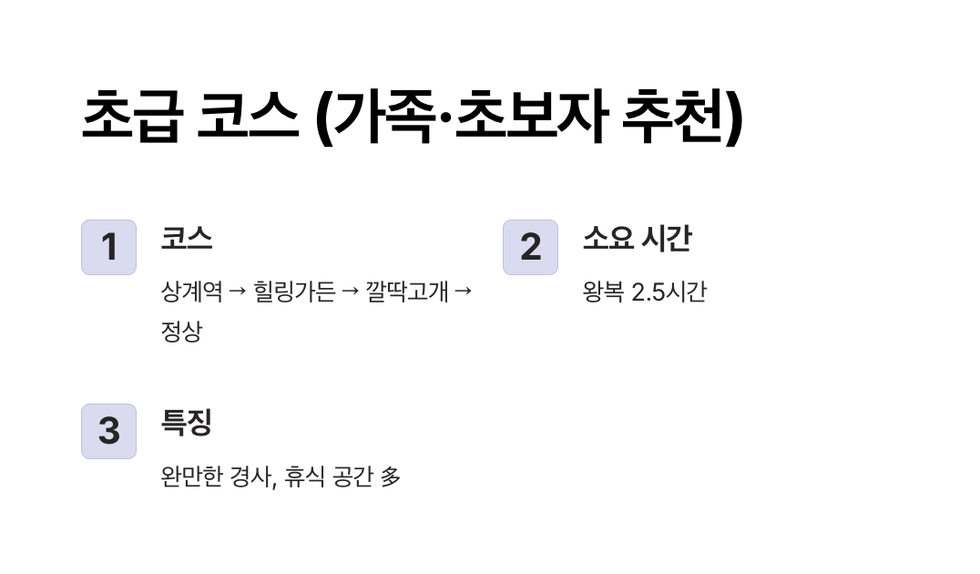 초급 코스는 등산 경험이 없는 초보자나 가족 단위 등산객에게 추천되는 가장 쉬운 등산로입니다. 전체적으로 경사가 완만하여 체력 소모가 적고, 곳곳에 쉼터와 전망대가 있어 여유롭게 산행을 즐길 수 있습니다.
