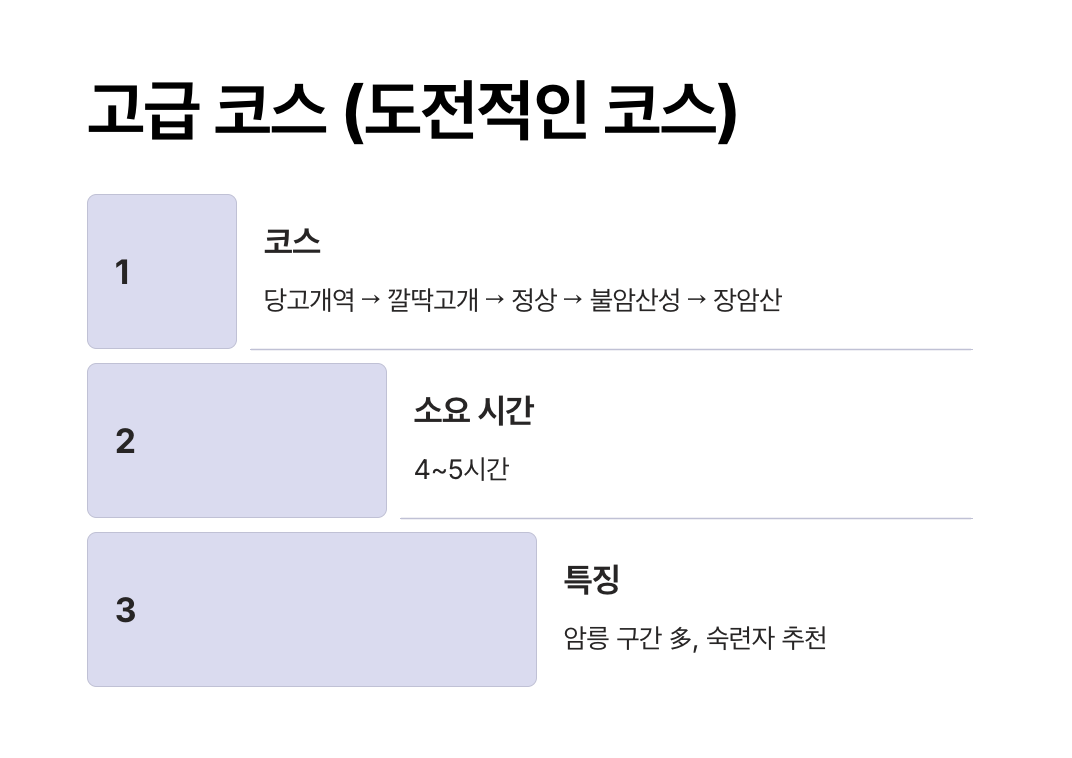 고급 코스는 암릉이 많아 등산 경험이 풍부한 숙련자에게 적합한 도전적인 코스입니다. 코스 초반부인 깔딱고개부터 가파른 구간이 시작되며, 정상 부근은 암벽을 오르는 듯한 느낌을 주는 곳도 많습니다.