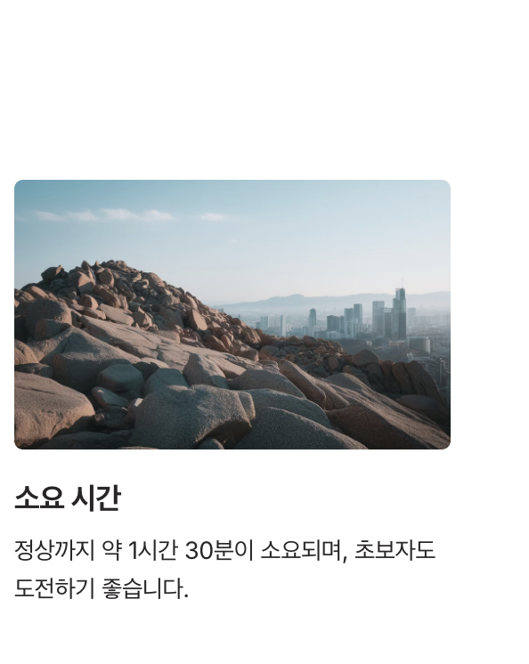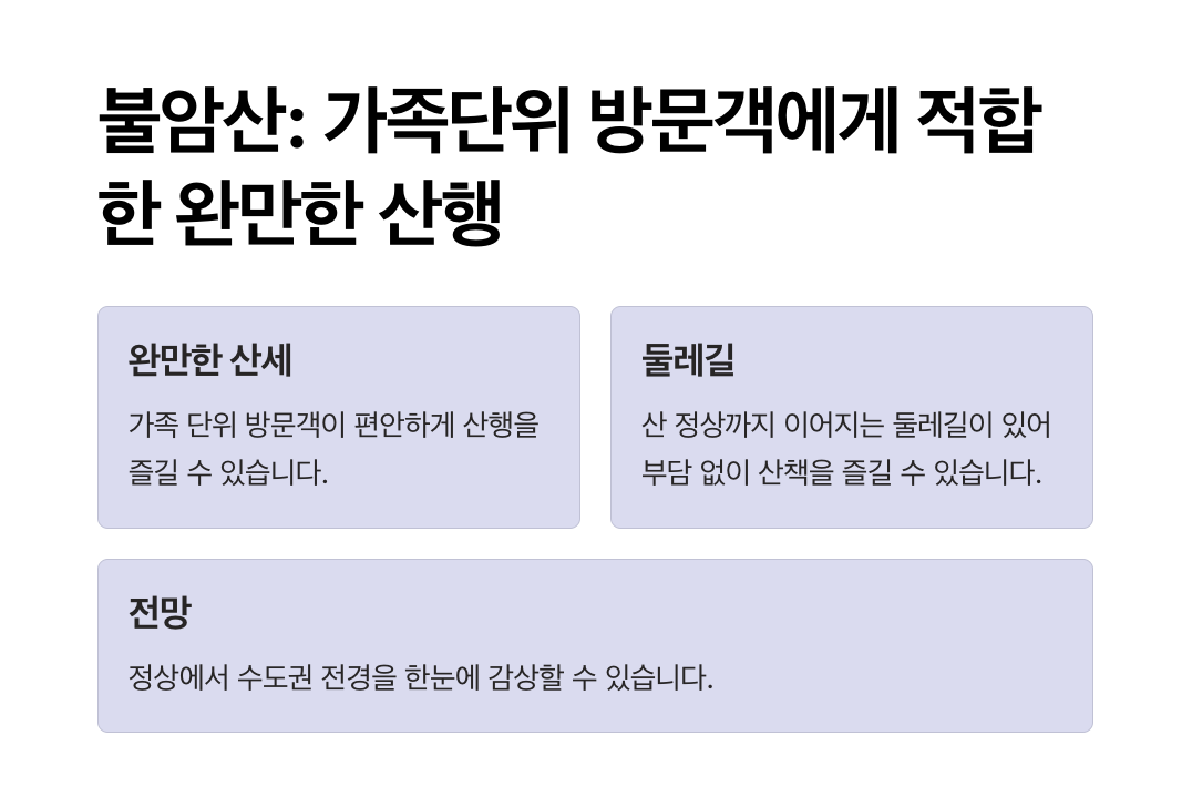 산세가 완만하여 가족 단위 등산객에게 적합하며, 정상에서는 서울 북부와 경기 일대가 한눈에 내려다보입니다. 둘레길이 잘 정비되어 있어 가벼운 산책에도 적합합니다. - 대중교통: