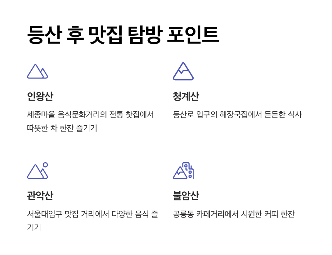 - A. 인왕산 주변에는 전통 찻집이 많은 세종마을 음식문화거리를, 청계산 입구에는 유명한 해장국집을, 관악산 근처에는 서울대입구 맛집 거리를 추천합니다.