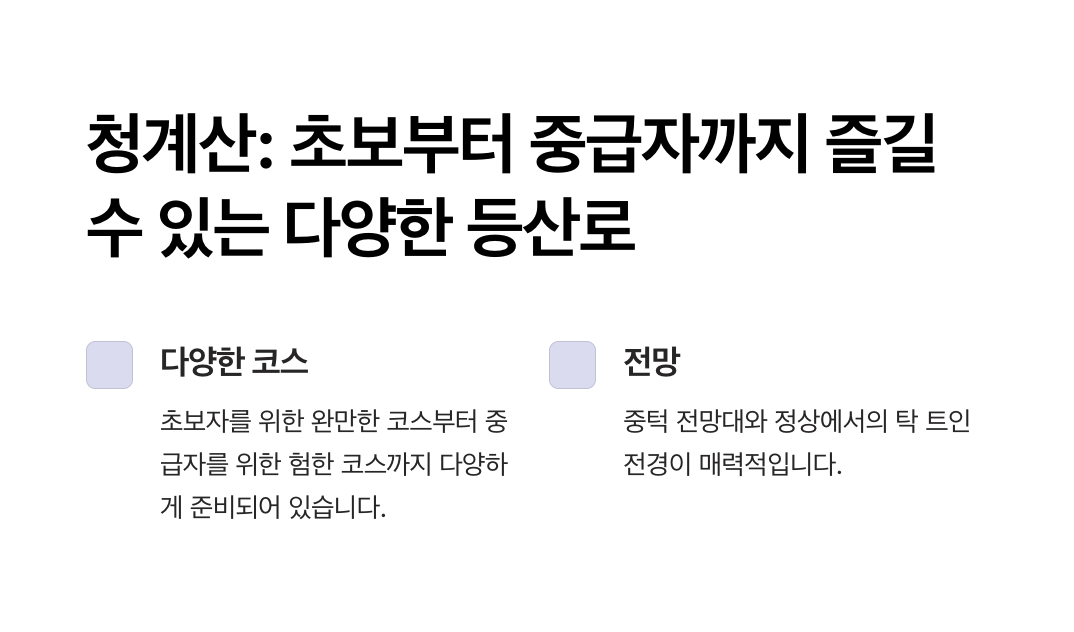 - A. 네, 가능합니다. 청계산에는 옛골 코스와 중턱 전망대 코스처럼 난이도가 낮고 짧은 거리의 코스가 있어 초보자도 부담 없이 오를 수 있습니다.