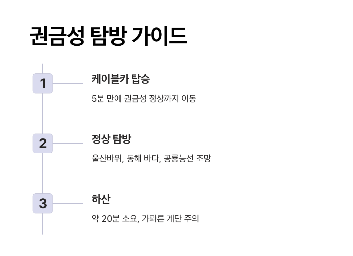 - 탑승 포인트: 권금성까지는 짧지만 1.2km 구간의 산길과 가파른 계단이 이어지므로 운동화나 등산화를 착용하세요.