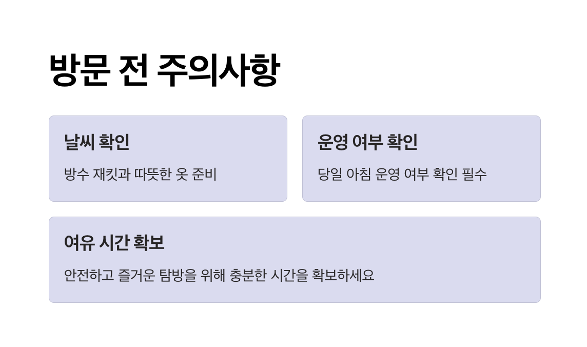 - 운영 여부 확인: 강풍, 폭우, 폭설 등 기상 악화 시 케이블카 운행이 중단될 수 있으므로 당일 아침 공식 홈페이지에서 운영 여부를 확인하세요.