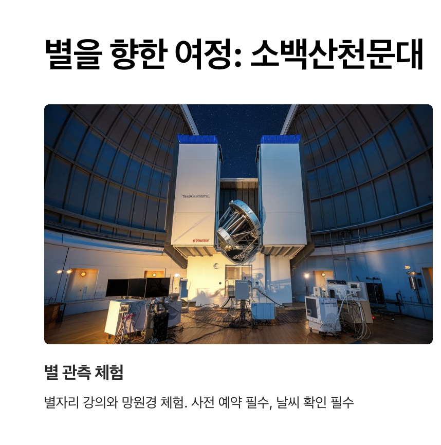 - A. 네, 소백산천문대는 연구 목적으로 운영되지만 국립공원공단에서 일반인을 위한 별 관측 체험 프로그램을 제공합니다. 예약이 필요하며, 맑은 날씨에만 진행됩니다.