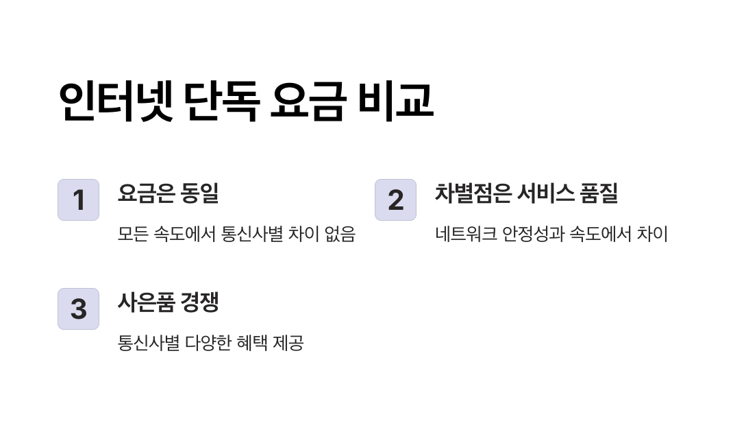 - 인터넷 단독 요금은 모든 통신사가 동일하지만, 가입 혜택(사은품, 와이파이 무료 제공 등)이 차이가 있음.