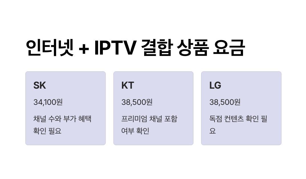- KT와 LG유플러스는 요금이 동일하지만, 제공 채널 수와 부가 혜택에서 차이가 있을 수 있음.