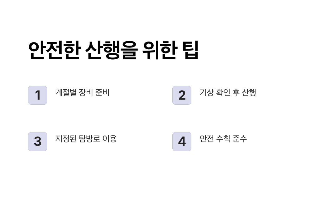 - 지정된 탐방로 이용: 비지정 구간은 위험하니 정해진 길을 따라 이동하세요.