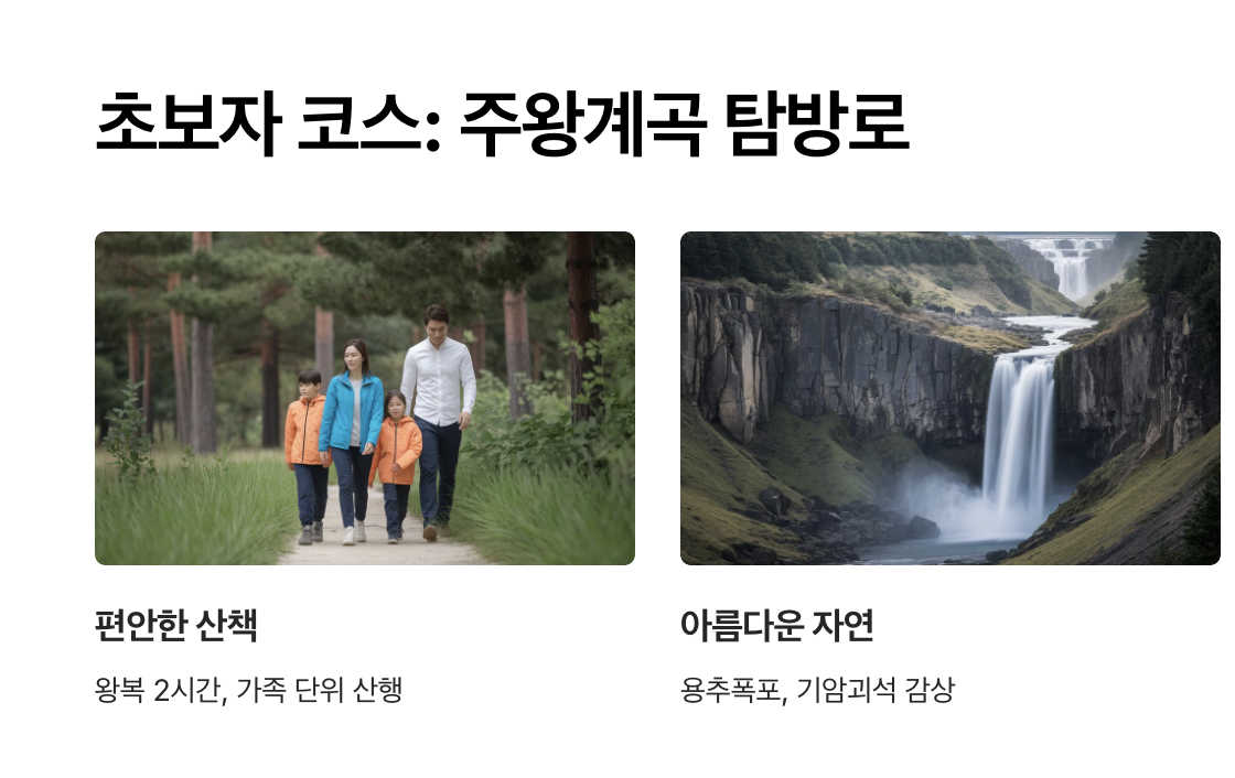 주왕계곡 탐방로는 평탄한 길과 완만한 경사로 구성되어 있어 어린이, 노약자, 초보 등산객 모두 부담 없이 걸을 수 있는 코스입니다. 계곡을 따라 걷는 동안 용추폭포와 기암괴석, 아름다운 숲의 풍경을 감상할 수 있습니다.